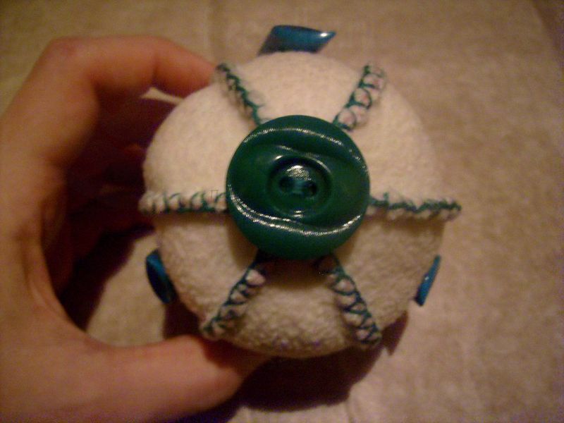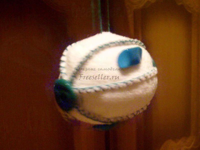 Сшить такой "снежный" ёлочный шар несложно и недолго. На ёлке он будет смотреться свежо и броско.