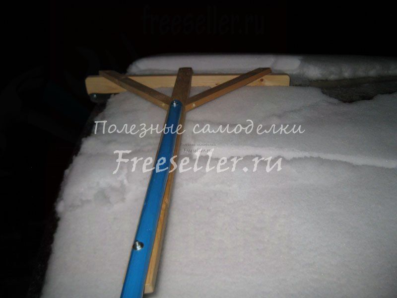 Самодельный скребок на длинной съемной рукоятке, достаточно несложный в изготовлении и позволяющий эффективно очищать крышу теплицы от снега.