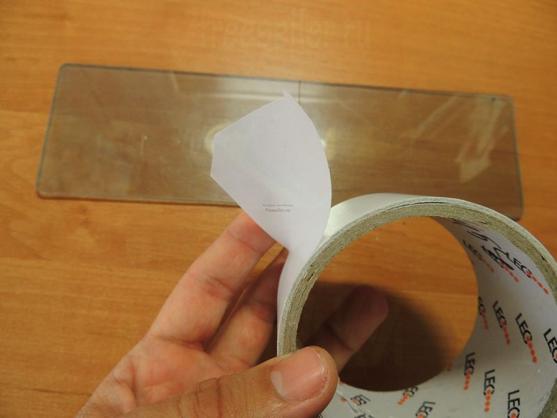 Далее нам понадобится двухсторонний скотч, клеем две полоски, сдираем слой.