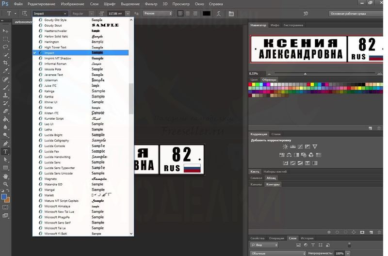 Для начала я нашел в интернете образец российского номерного знака, в PSD формате, для Photoshop, и стал изменять его, так как в нем были некоторые недочеты, шрифт, цвет, размеры не те и т.д .