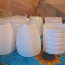 На одну розу уходит одна молочная булка из-под кефира, у которой надо отрезать дно и верхнюю узкую часть и разрезать пополам.