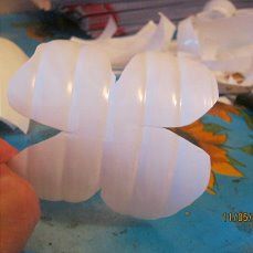 Я делала сразу на несколько роз, поэтому у меня бутылок будет больше. Затем режем эти половинки еще пополам и у нас получается из бутылки 4 части, которые мы режем еще на 4 части, но не совсем, а не доходя до середины.
