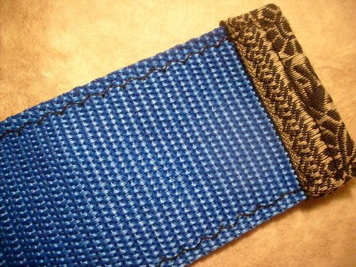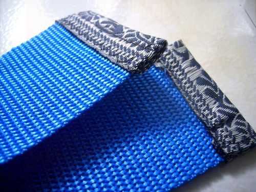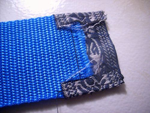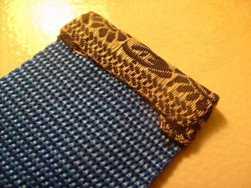 5. Второй узкий край полоски из стропы обтачиваем тесьмой таким же образом.