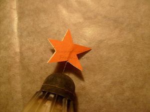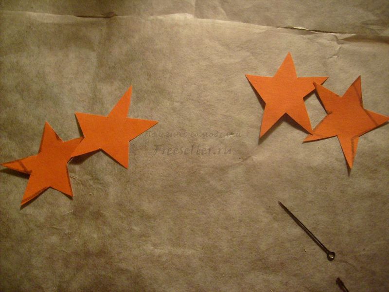 6. Сложив лист красной бумаги вдвое, вырезаем из него две пары звёздочек. Закрепим их на булавки.