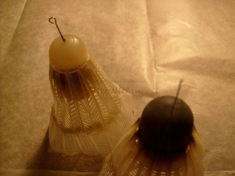 7. Раскалив острия булавок на огне, плотно вплавляем их в верхушки наших ёлочек.
