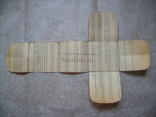 1. Строим выкройку сундучка. Вычерчиваем квадрат размером 6 на 6 см. От него по всем сторонам вычерчиваем ещё 4 таких же квадрата. К одному из этих четырёх причерчиваем ещё один квадрат и далее прямоугольник размером 6 на 5 см. Внешние стороны округло срезаем.
