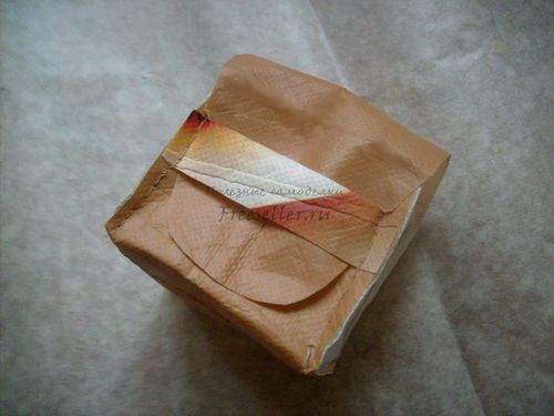 7. Загибаем верх сундучка. Застёгиваем его, продев клапан под полоску.