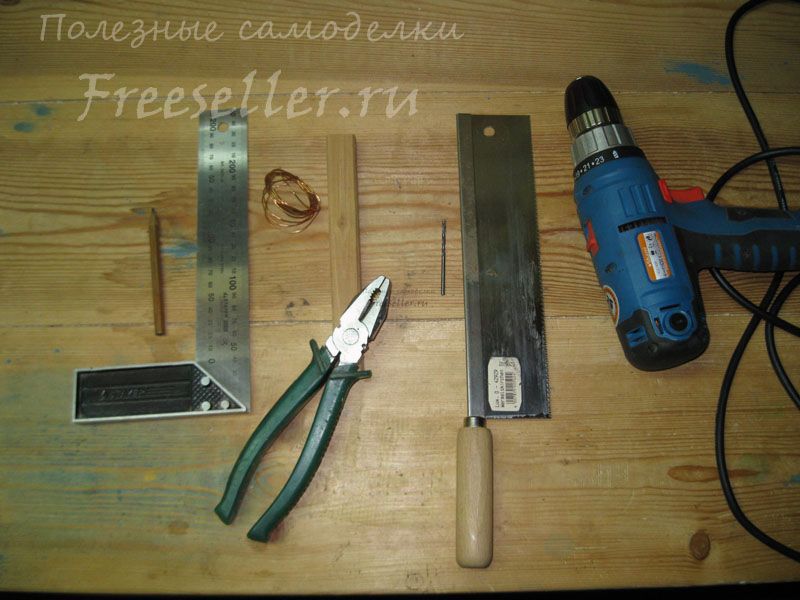 Для этого мне понадобились: небольшая деревянная планка, моток проволоки, небольшая ручная пила, электродрель со сверлом диаметром 2,5 мм, пассатижи, а также угольник и карандаш.