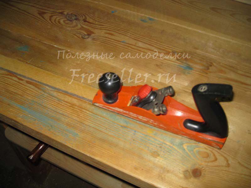 Сначала обстругиваем длинную деревянную планку ручным рубанком.