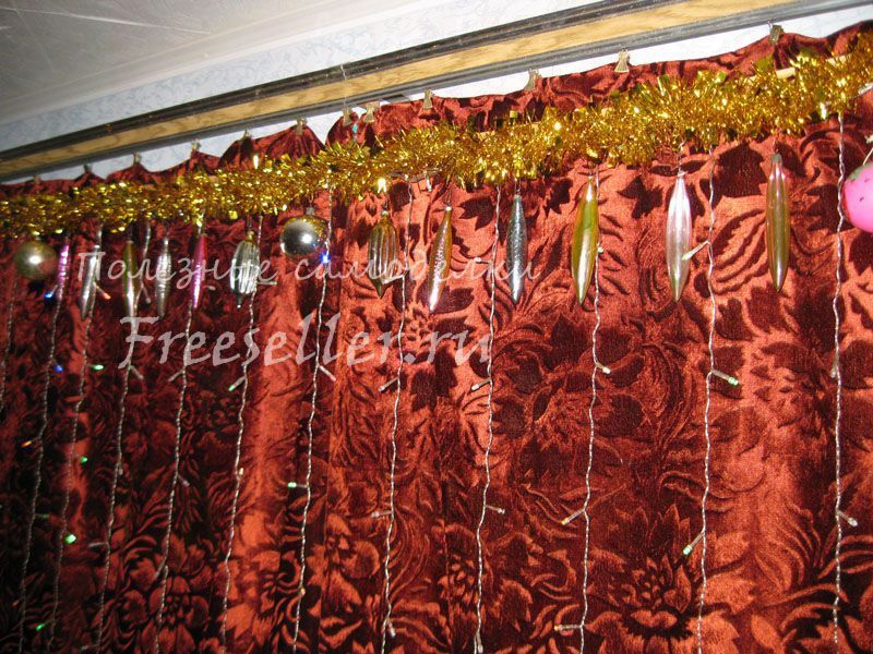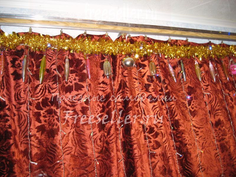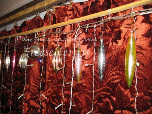 При этом я пришел к выводу, что лучшим способом такого украшения, было бы развесить все игрушки и гирлянды на карнизе для штор. Однако это невозможно, поскольку и повесить их не на что, да и шторам они будут мешать.