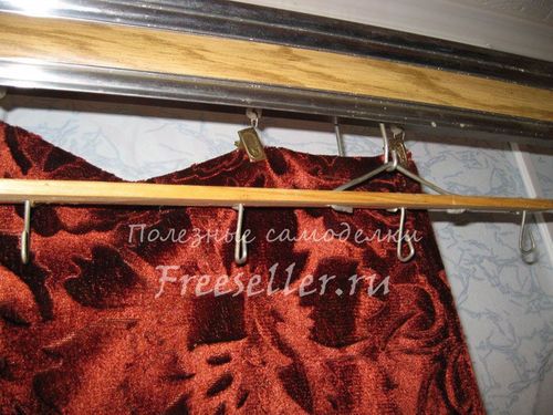 В итоге, я реши изготовить достаточно простое приспособление - подвес на шторный карниз, представляющий из себя длинную деревянную планку с проволочными крючками.