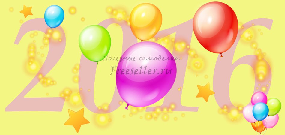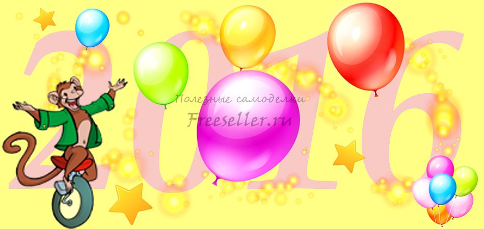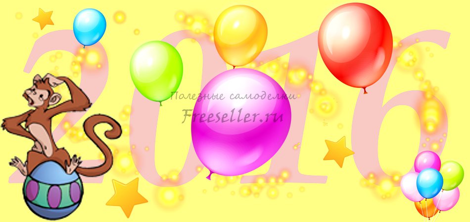 1. Строим прямоугольник размером 950 на 450 пикселов. Заливаем фон жёлтым. Наносим надпись "2016". Рисуем огненные дорожки. В последнюю очередь добавляем клипарт-объекты - картинки PNG на прозрачной основе.