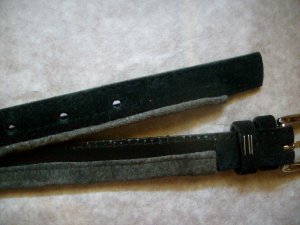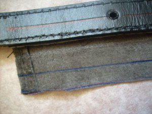 4. Подвернув второй длинный срез полоски вовнутрь, совместив линию сгиба с серединой ремня, пришиваем полоску с изнанки. Половина ремня обработана.