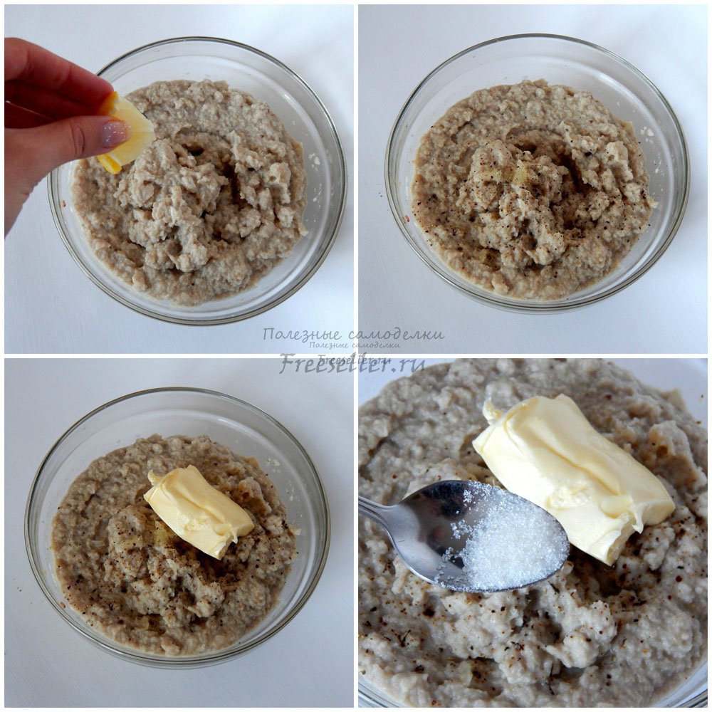 7. К полученной массе добавить сок лимона, черный молотый перец или другие специи, размягченное сливочное масло и пол чайной ложки сахара.