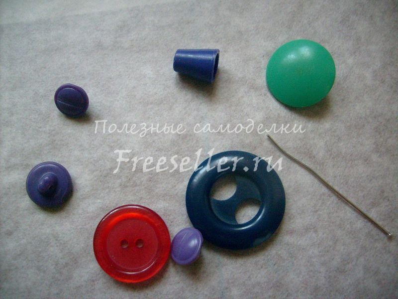 Для изготовления такого брелока нам понадобились пуговицы различных размеров, цветов и конфигурации. Старых пуговиц, наверное, полно в любом доме, поэтому подобрать подходящие можно без труда. Кроме них, мы использовали шнурочный конус-наконечник и бижутерный гвоздик. Из материалов и инструментов нам пригодились вата, суперклей, пассатижи и большой гвоздь.