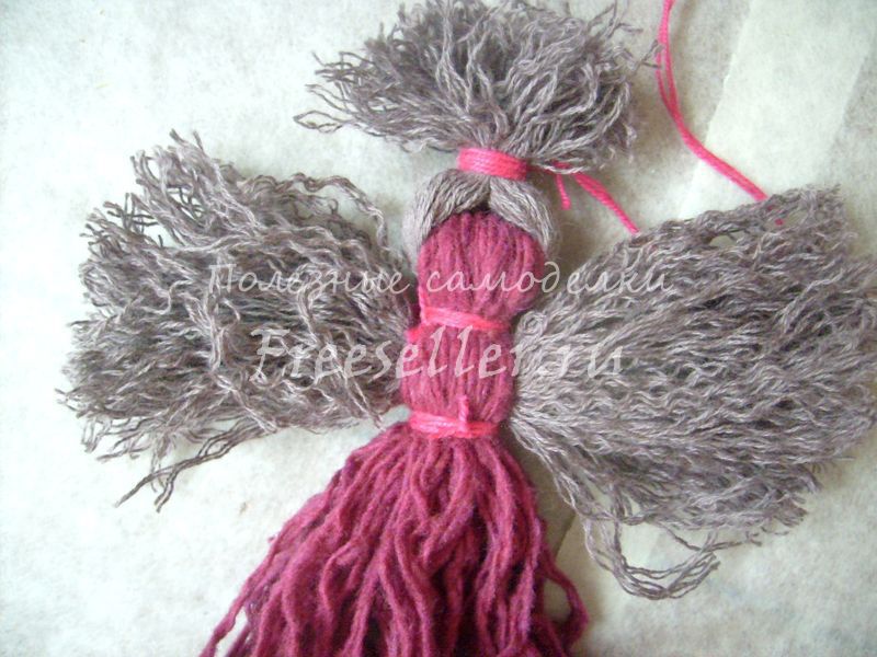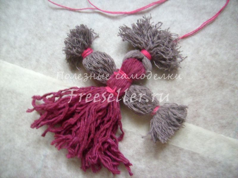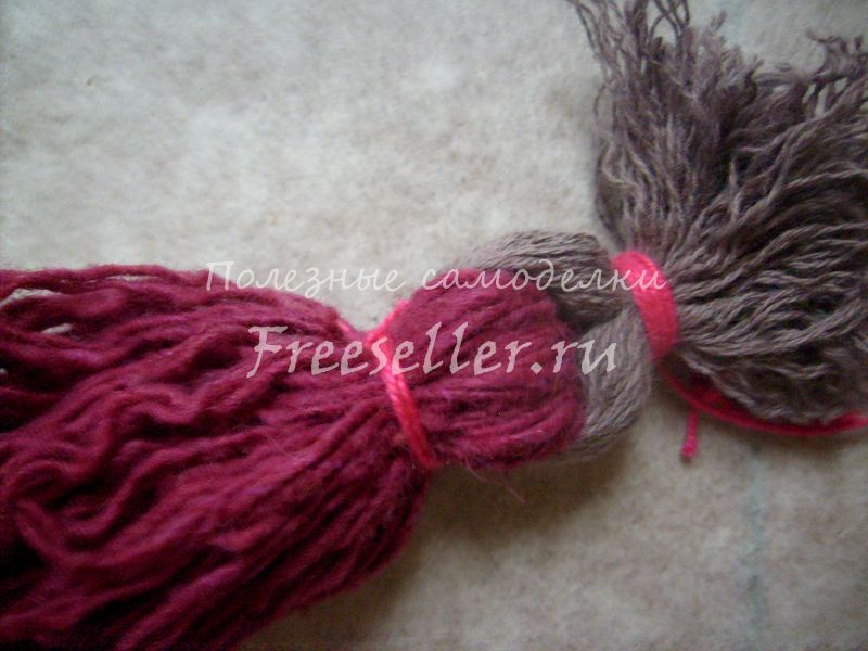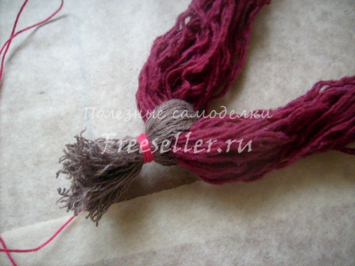 2. "Голову" и "юбку" складываем пополам, совмещаем середины и туго затягиваем концы "волос" поверх второго жгутика контрастной нитью.