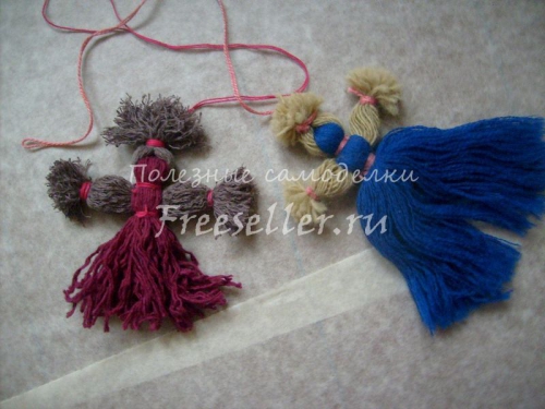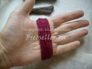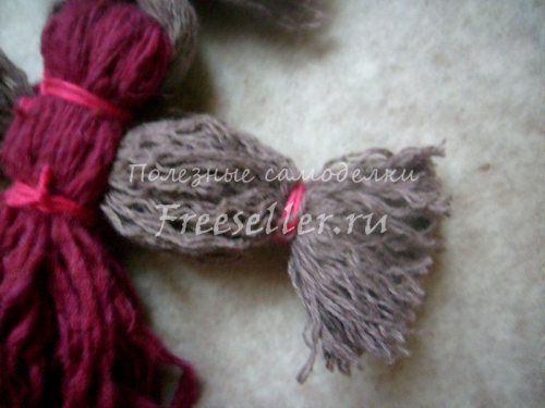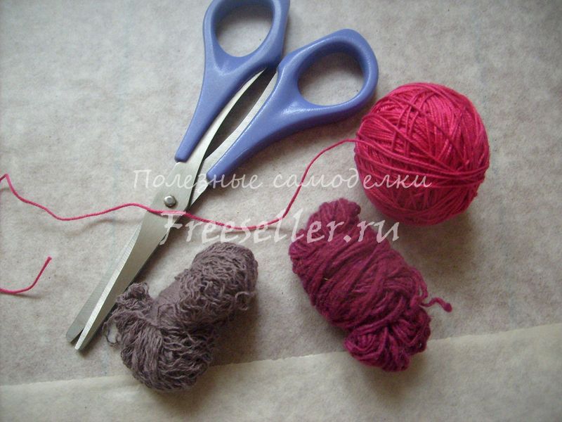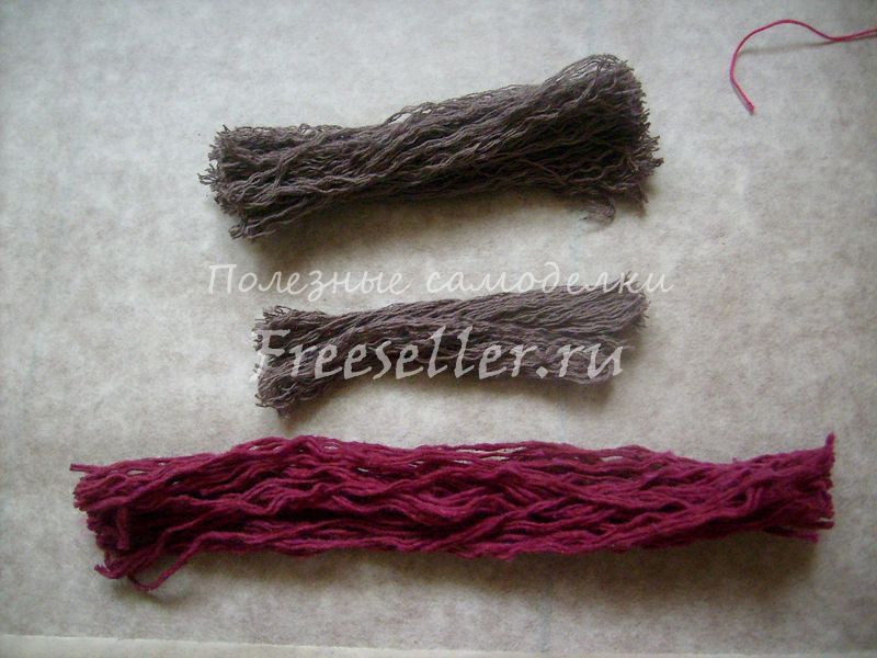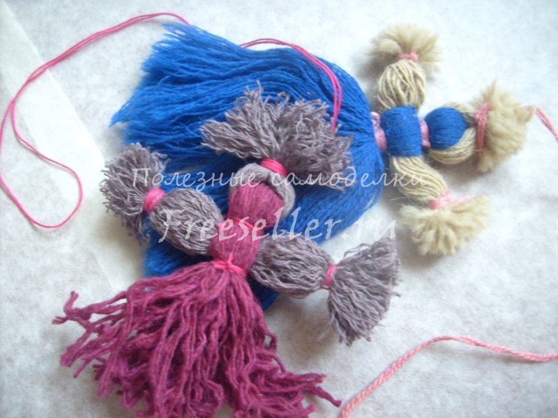 1. Наматываем пряжу ( удобнее всего на руку) и нарезаем из неё жгутики. Жгутики нужны разной длины. Самый короткий и тонкий для головы и волос. Длиннее и толще для рукавов. Самый длинный и толстый для туловища и юбки.
