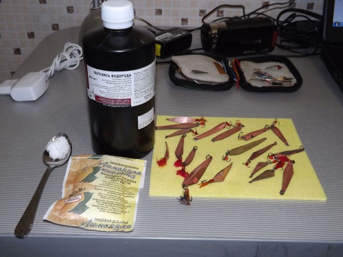 Я взял 40-50г перекиси водорода (заранее подогрел ее в кружке), насыпал 1/3 чайной ложки лимонной кислоты, и сыпанул поваренной соли на кончике ложки (самую малость). Вкинул блесенку в раствор, и как только начали появляться пузырьки ее достал. Дальше протер поролоновой губкой и остался доволен.
