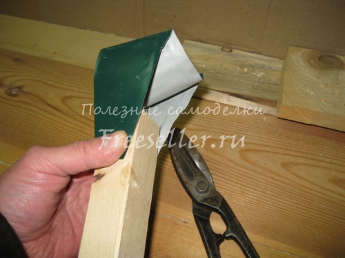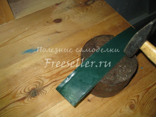 Сначала берем отрезок листа от профнастила и выпрямляем его на наковальне ударами молотка, заодно и упрочняя его края.