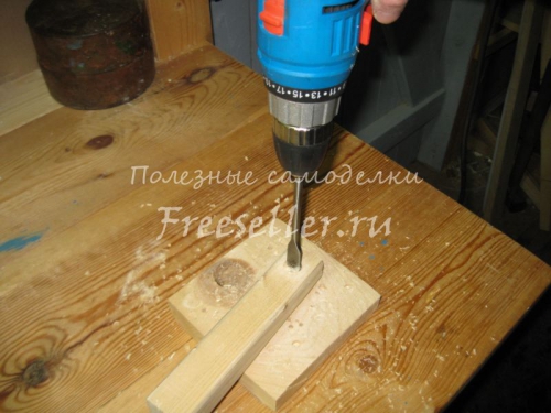 Перовым сверлом диаметром 16 мм, высверливаем отверстие на конце бруска для возможности его подвешивания на гвоздь или крючок.