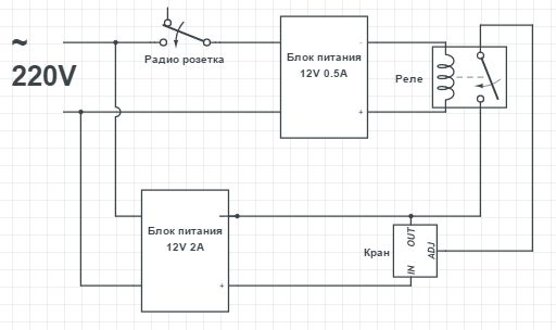 Блок питания на 12В 2А будет постоянно подключен сети 220В и соединен с электро-краном. Нулевая фаза подсоединяется через управляемые контакты реле к управляющему проводу электро-крана. К сети 220В также будет подключатся радио-розетка, которая по сигналу от контроллера подаст питание на дополнительный блок питания 12В 0,5А, который управляет реле.