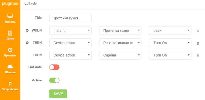 Правила же предлагают автоматизацию всей системы. Они бывают трех типов: событийные, по-расписанию, или по-значению. Правила по-событию будут моментально реагировать на изменение состояния устройств. Например, срабатывание датчика протечки и, как следствие, перекрытия воды, срабатывание датчика движения и включение сирены.
