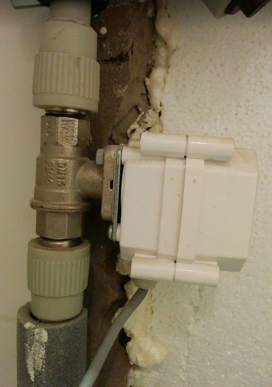 Основной компонент, водяной шаровой кран с электроприводом, установлен на вводе холодной воды в квартиру. Он работает от блока питания на 12В, который подключается к основным проводам. Для закрытия крана, третий, управляющий провод должен быть соединен с нулевой фазой. При отсоединения управляющего провода от “нуля” кран откроется.