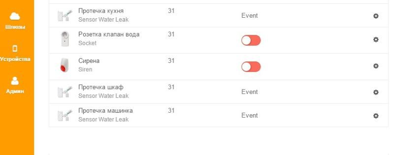 Выбирая на вкладке “Устройства” мы попадаем на страницу, где отображены все подключенные в систему датчики и девайсы. Так-же здесь можно увидеть и изменить их состояние, удалить, переименовать или добавить новое устройство.