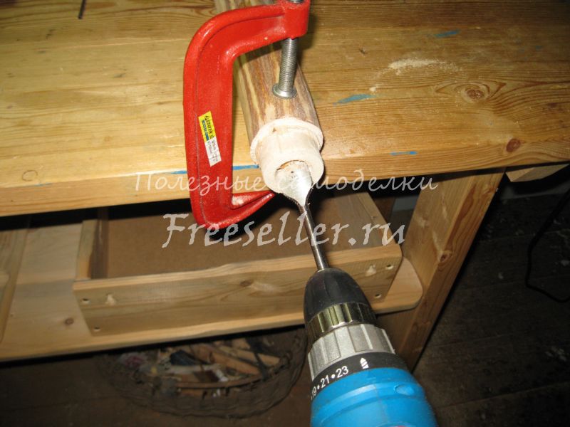 Затем опять убираем лишнюю древесину перовым сверлом. И так делаем несколько раз попеременно, пока у нас глубина внутреннего отверстия не достигнет 4,5-5 см. Кстати, для этих операций лучше использовать две дрели (если есть возможность), чтобы каждый раз не переставлять сверла.