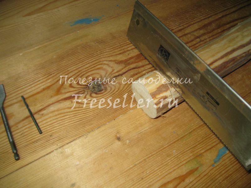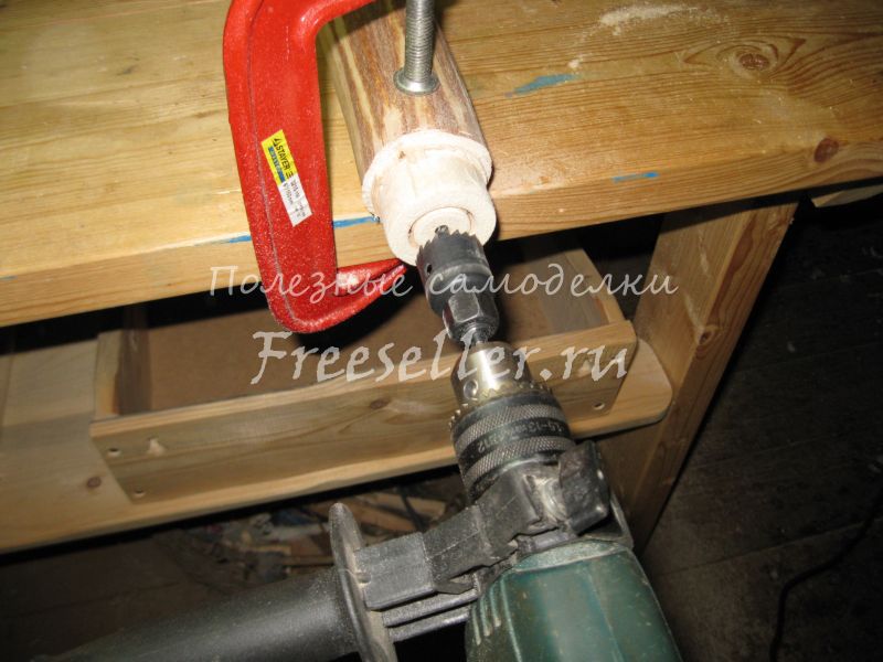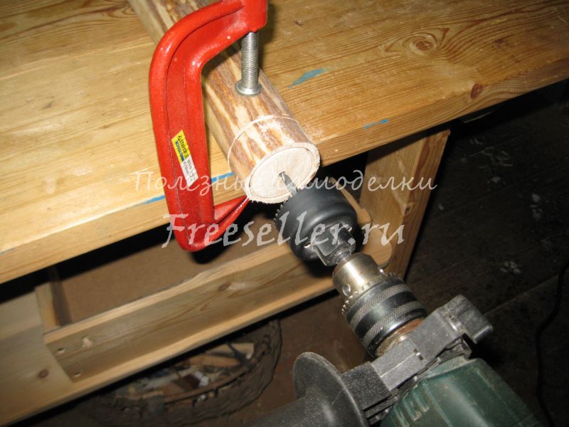 После этого размечаем на торце заготовки центр, зажимаем ее струбциной и делаем вдоль продольной оси заготовки, пропил до упора, с помощью кольцевой пилы диаметром 51 мм, установленной в дрель.