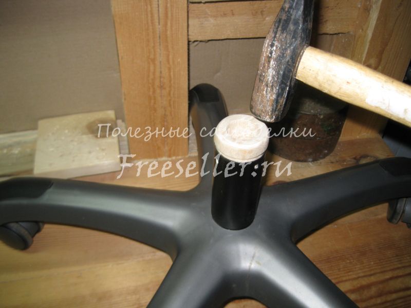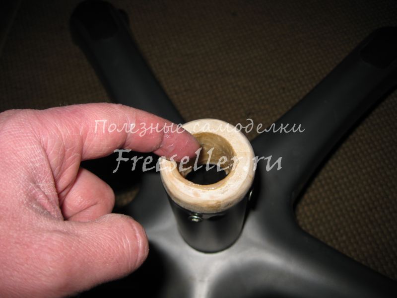 Самостоятельный и совершенно бесплатный ремонт компьютерного кресла, заключающийся в замене пластиковой втулки удерживающей цилиндр газлифта, на деревянную втулку, изготовленную своими руками.