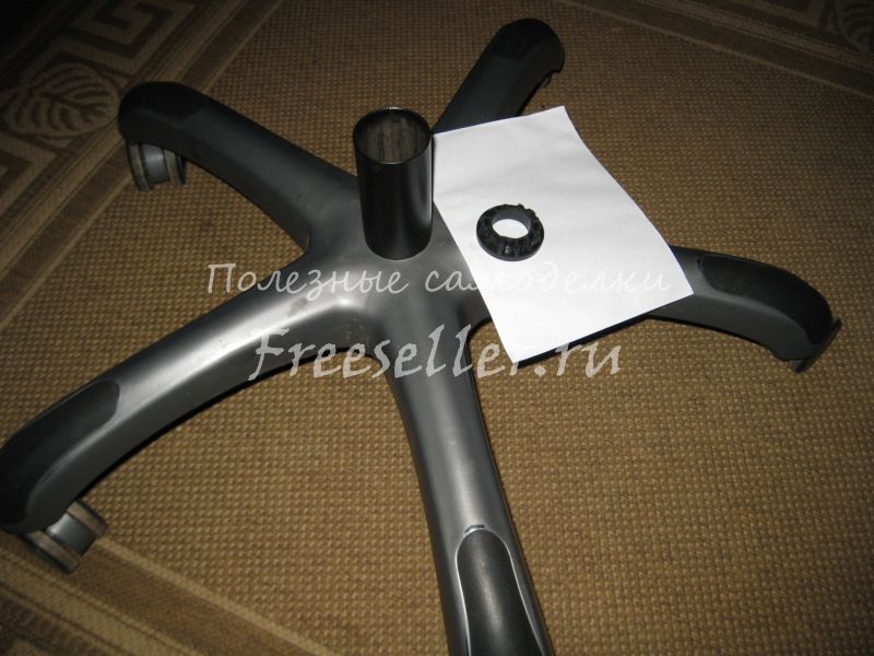 Ну а теперь, окончательно собираем кресло, то есть, одеваем на шток газлифта подшипник, затем крестовину с трубкой и втулкой одеваем на цилиндр газлифта, устанавливаем наружную шайбу и фиксирующую шайбу-защелку.