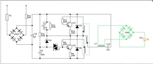 Переделка заключается в намотке на дроссель вторичной обмотки, установке на плате перемычек и подключении диодного моста (диоды HER.FR.UF)
