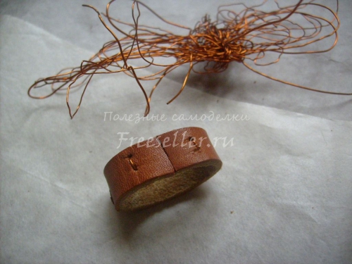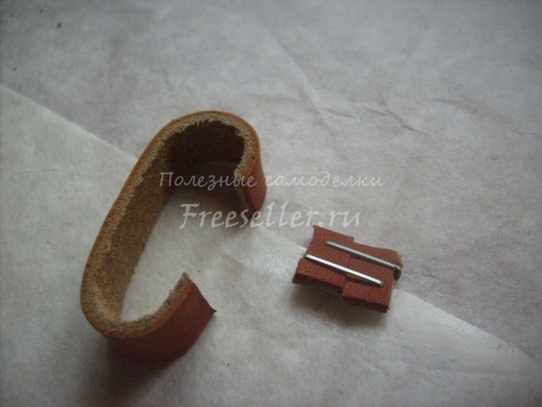 Шилом размечаем и пробиваем с обеих сторон по два отверстия. Стягиваем концы кожаной полоски в кольцо проволокой. Туго свиваем её концы с внутренней стороны пряжки и загибаем их к её нижней поверхности.