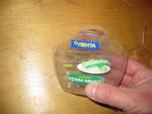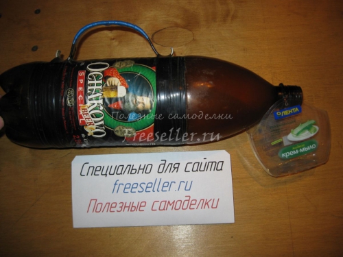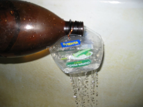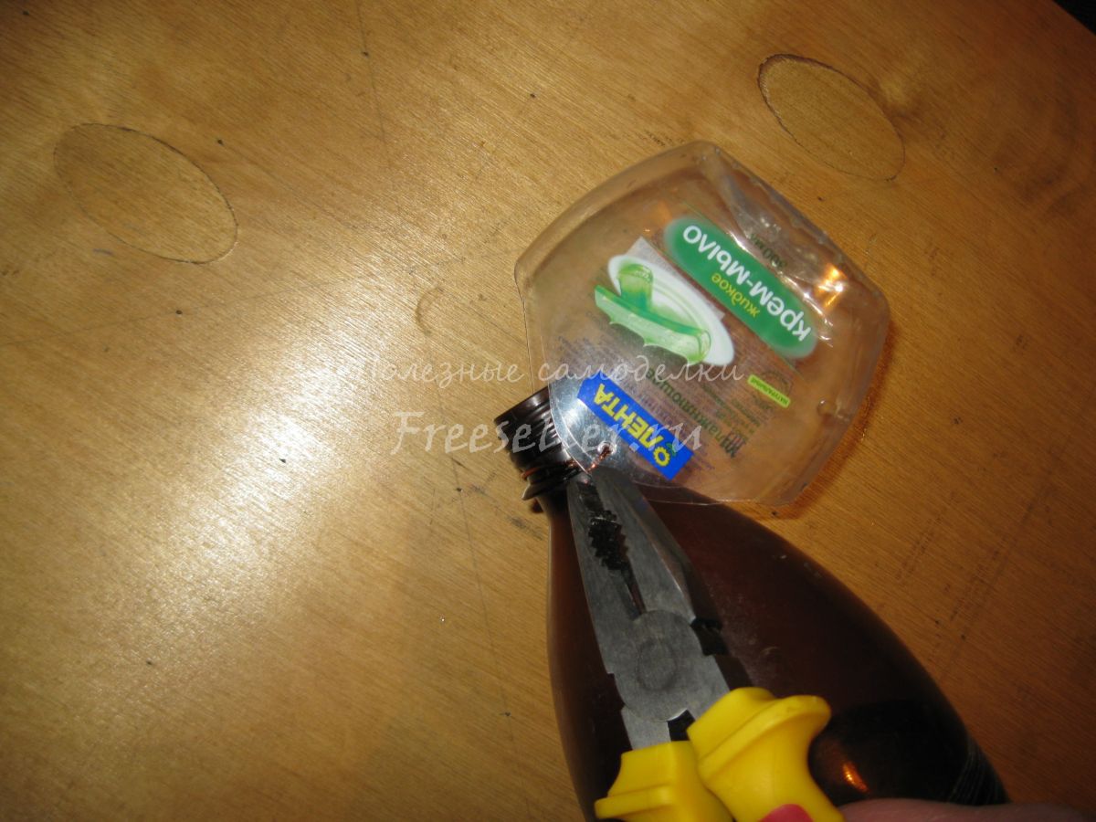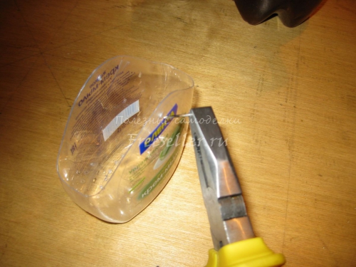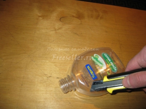 Итак, сначала при помощи канцелярского ножа, вырезаем из флакона от жидкого мыла, заготовку для нашей лейки.