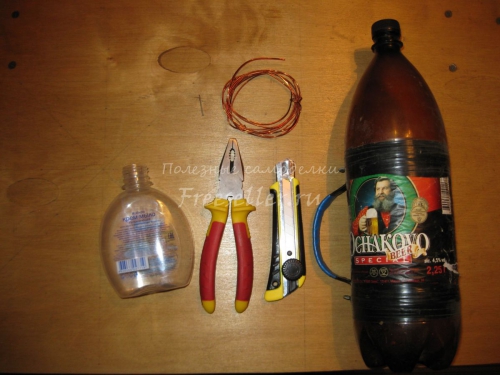 Для изготовления такой лейки, мне также понадобились двухлитровая пластиковая бутылка, флакон от жидкого мыла и кусок небольшой, но достаточно прочной проволоки. Из инструментов понадобились канцелярский нож, пассатижи, тонкий маленький гвоздик и изоляционная лента.