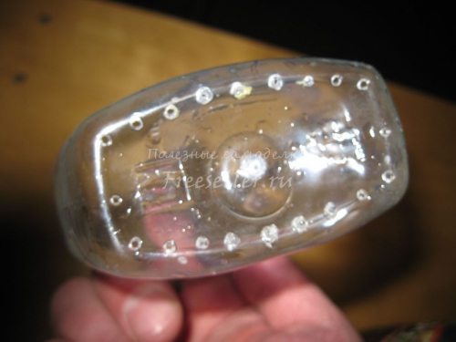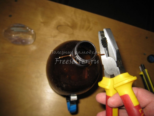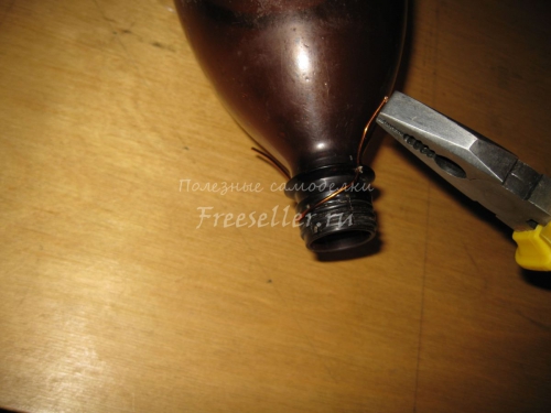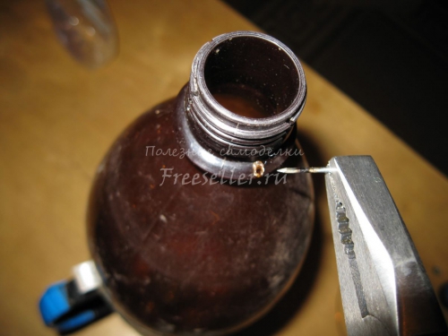 А затем, проплавляем еще две дырочки в выступе горлышка пластиковой бутылки, с двух противоположных сторон.