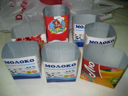 Для их упаковки, я взял заранее заготовленные (промытые и высушенные), пакеты из-под молока и сока разного размера, с отрезанными верхушками.