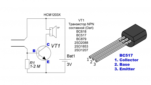 Схема не потребляет тока, пока транзистор закрыт, и батарейки должно хватить надолго.