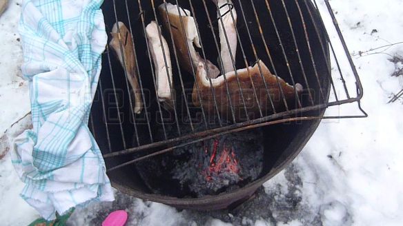 Все готово. Сало, мясо, рыбу и т.п. подвешиваем крючками из проволоки на решетку от старого холодильника. Сверху накрываем мокрой тканью и можно приступать к копчению.