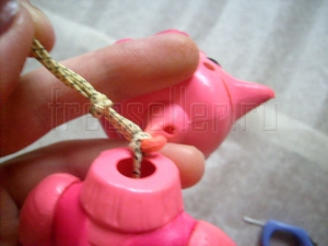 9. Осталось закрепить голову Буратино. Натягиваем вертикальный отрезок резинки. Крепим его узлом за крюкообразный выступ головы. Рядом завязываем ещё один узел. Заправляем его в отверстие головы.
