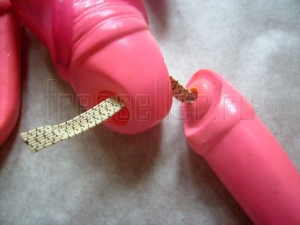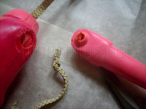 6. Как бы точно вы ни рассчитали длину резинки для плотного прилегания ног к туловищу, со временем резинка всё равно ослабнет. Её постоянное натяжение мы обеспечим с помощью вертикально закреплённого отрезка. Привязываем его к первому отрезку, натянув его, чтобы узел получился ближе к середине.