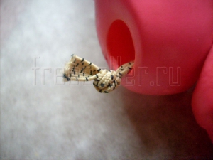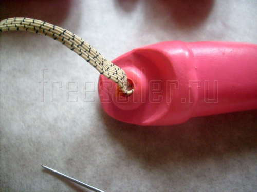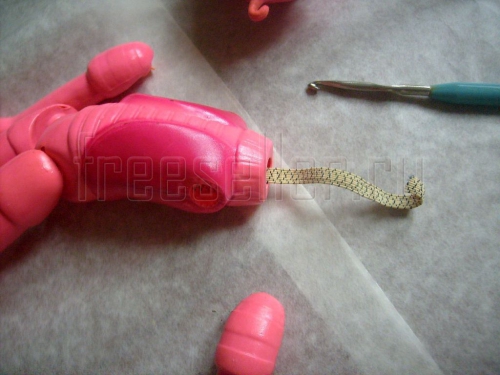 7. Вязальным крючком вытягиваем конец второго отрезка наружу через "шею".