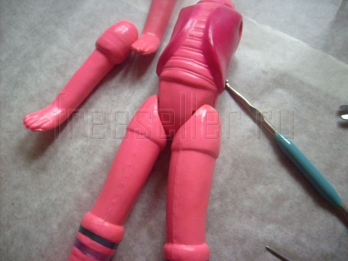3. Начнём с ног. Остриём булавки заправляем узел в отверстие с внутренней стороны одной из них.