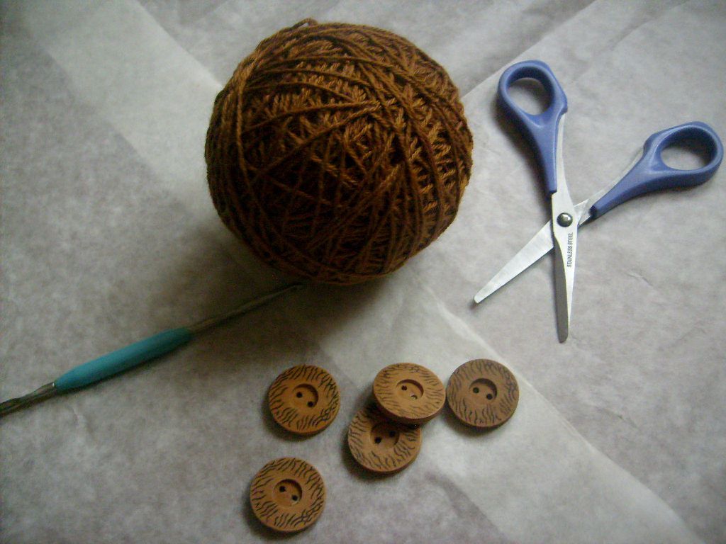 Наша черепаха будет состоять из трёх вязаных деталей - брюшка, панциря и головы, а четыре лапки мы смастерим из восьми попарно соединённых плоских пуговиц. Для её изготовления нам понадобится немного пряжи средней толщины, восемь пуговиц, вата для набивки, вязальный крючок и швейные принадлежности.