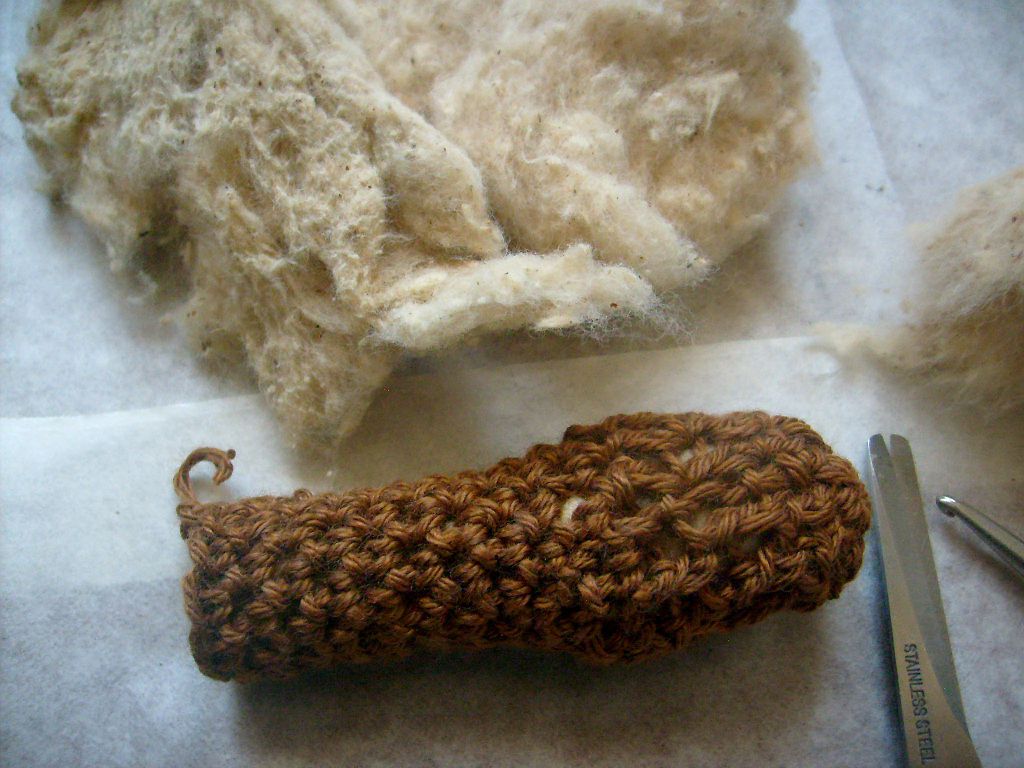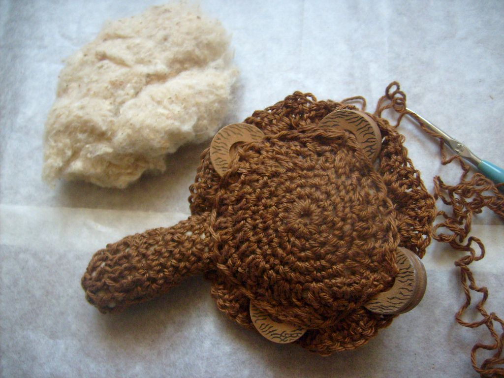 Ближе к концу шва оставляем зазор для набивки черепахи. Наполняем её ватой и заканчиваем шов.