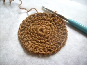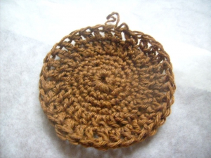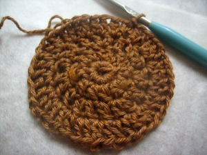 1. Вяжем брюшко - круг диаметром около 7 см. Для этого набираем цепочку из 5 воздушных петель, замыкаем её в кольцо, провязываем в него 7 полустолбиков. Далее за счёт прибавок наращиваем длину окружности. Ряды попеременно вяжем то полустолбиками, то столбиками с накидом.