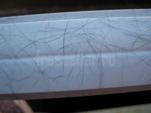 После этого, посмотрим на поверхность рейки, которой она соприкасалась с покрывалом. Как видно, на нее налипло достаточно большое количество шерсти и даже мелких частиц мусора.