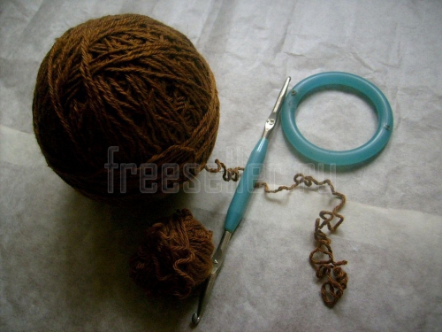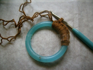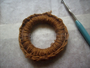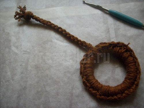 1. Обвязываем пластмассовое кольцо по кругу с помощью крючка.