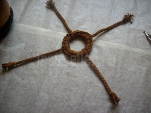 2. Нарезаем два жгута по пять нитей пряжи достаточной длины для плетения жгута. Крепим их к кольцу и плетём шнур длиной 12 см. Заканчиваем плетение узлом, обрезаем нити.